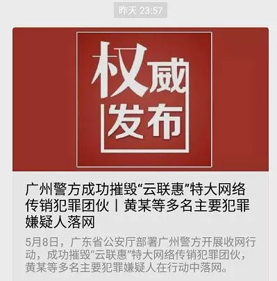 2018年5月8日7時,網(wǎng)絡(luò)傳言云聯(lián)惠官網(wǎng)及app無法打開,下午發(fā)布申明是系統(tǒng)維護(hù),當(dāng)日萬23時55分許,警方發(fā)布云聯(lián)惠被查的信息。事實(shí)上,早在當(dāng)天上午,就有多人拍攝到云聯(lián)惠廣州總部被大批警務(wù)人員包圍的視頻,并上傳到社交媒體,同時,云聯(lián)網(wǎng)官網(wǎng)及APP均無法登陸。