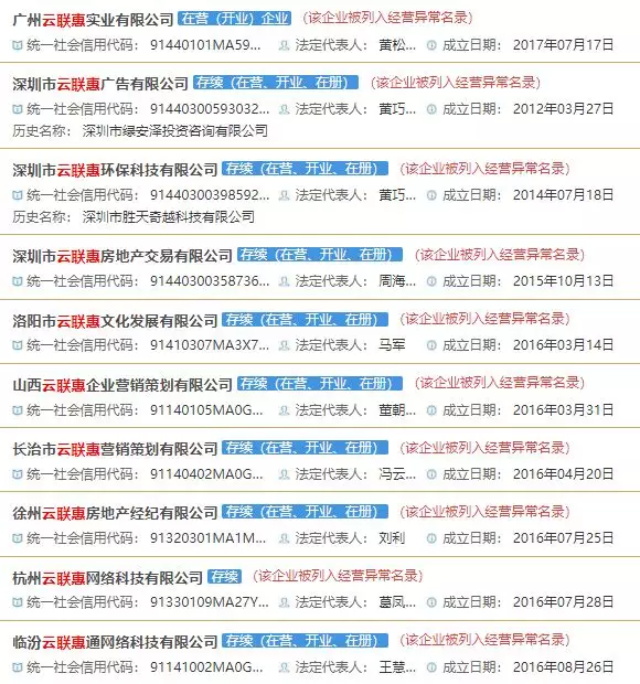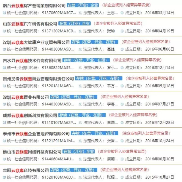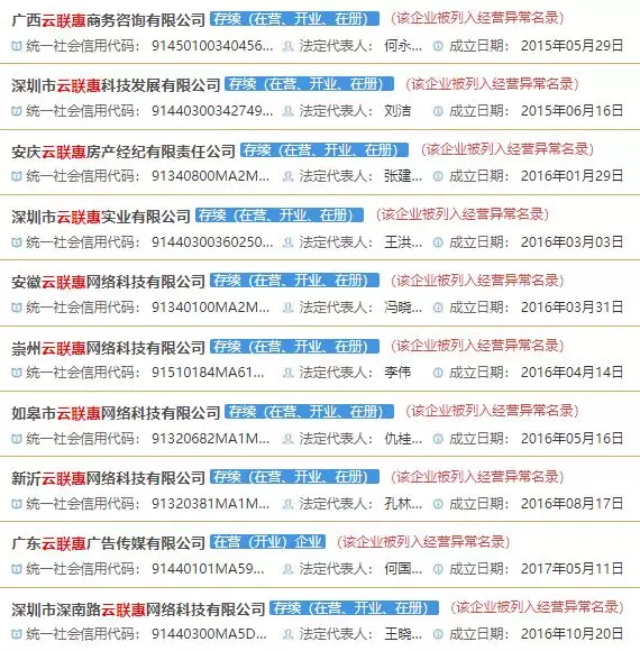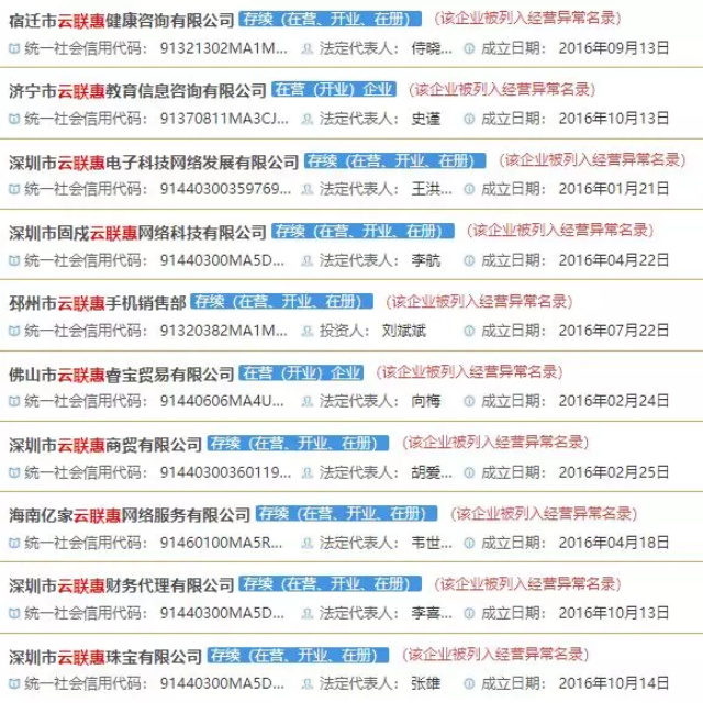“******企業(yè)信用信息公示系統(tǒng)”中顯示,已有68家云聯(lián)惠子公司處于“經(jīng)營異常名錄”中,而其中一家公司,除了“經(jīng)營異常名錄”外,還有“嚴重違法失信企業(yè)名單”,原因不言而喻,提交虛假材料或者采取其他欺詐手段隱瞞重要事實,取得公司變更或者注銷登記,被撤銷登記的。