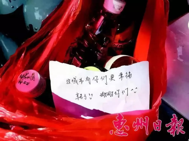 2018年2月,在廣東惠東,一位不知名的大姐將6瓶飲料悄悄放在交警的警用摩托車上,并附上一張感謝的紙條后悄然離開。“這城市有你們更幸福,辛苦了!謝謝你們!”