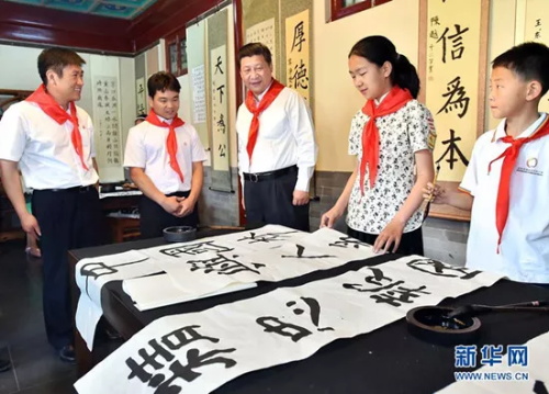 △習近平在北京市海淀區(qū)民族小學看孩子們練習書法