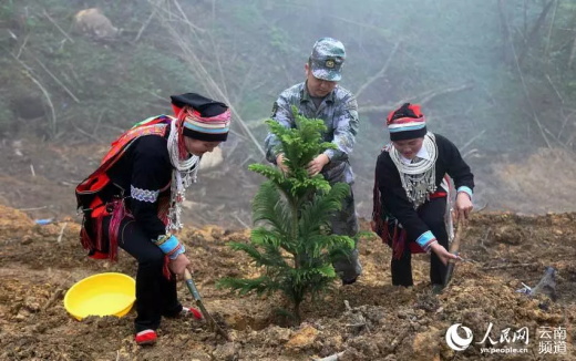 當(dāng)?shù)厣贁?shù)民族群眾與掃雷官兵在已掃雷場植樹。人民網(wǎng)虎遵會 / 攝