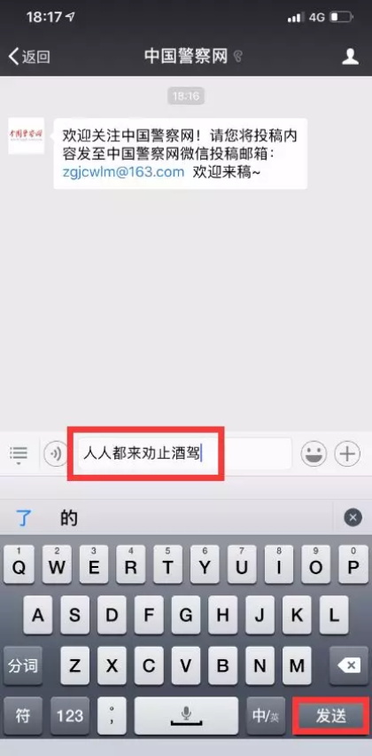 4、輸入人人都來勸止酒駕,并點擊發(fā)送