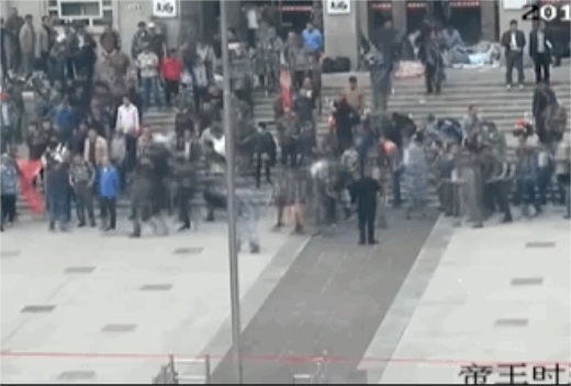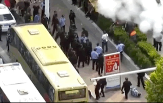 由于受干粉噴射,車內(nèi)執(zhí)勤民警和被帶離人員呼吸困難,被迫從車輛天窗口爬至車頂,現(xiàn)場聚集人員仍不甘心,繼續(xù)用滅火器噴射車頂上的民警并投擲石塊。