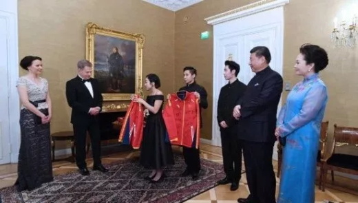 2017年4月,習(xí)近平主席訪問芬蘭,在尼尼斯托總統(tǒng)夫婦舉行的歡迎宴會(huì)上,剛剛參加了******花樣滑冰錦標(biāo)賽的中芬冰雪運(yùn)動(dòng)員為兩國(guó)元首夫婦送上運(yùn)動(dòng)衣。