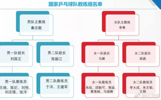 今天,中國(guó)乒協(xié)還公布了新一屆******隊(duì)教練組名單,男女隊(duì)主教練分別為秦志戩和李隼,男女一隊(duì)組長(zhǎng)分別為劉國(guó)正和馬琳。新一屆中國(guó)乒乓球隊(duì),首次采用主教練、組長(zhǎng)雙軌制負(fù)責(zé)制。主教練為******責(zé)任人,組長(zhǎng)為第二責(zé)任人。