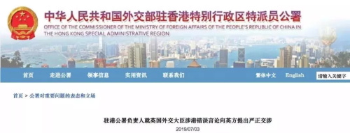 我們對英國外交大臣多次發(fā)表錯誤涉港言論表示強烈憤慨,公署負責人已經就此向英國駐港總領館負責人提出嚴正交涉,表達強烈不滿和堅決反對。