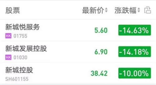 如,新城發(fā)展控股尾盤閃崩,由漲變跌,收盤大跌23.86%,報(bào)8.04港元,市值蒸發(fā)149億港元。新城悅同樣暴跌近24%,市值蒸發(fā)近17億港元。