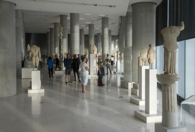 地中海溫暖的陽光透過雅典衛(wèi)城博物館玻璃幕墻灑入展廳,
