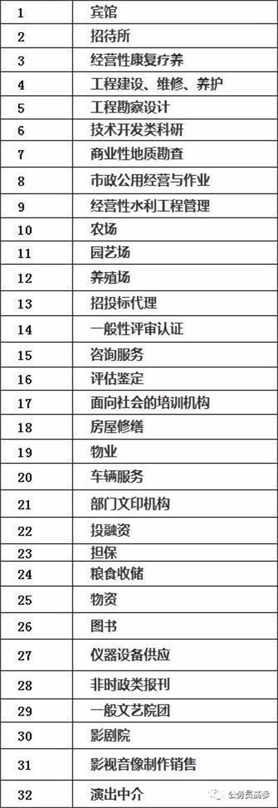 ⑤社會經(jīng)濟(jì)服務(wù)類:人才交流服務(wù),人防工程管護(hù),對外交流服務(wù),種苗良種培育,混合經(jīng)營型林場,準(zhǔn)公益性水利工程管理,公益性地質(zhì)勘查,實行有償服務(wù)的農(nóng)業(yè)技術(shù)推廣等。